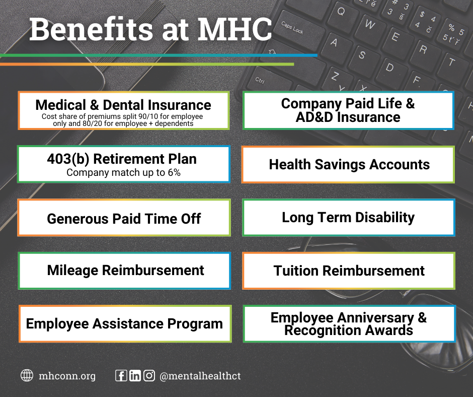 Mental Health Connecticut, Inc. is an equal opportunity employer. All employment decisions are made without regard to race, color, age, gender, gender identity or expression, sexual orientation, marital status, pregnancy, religion, citizenship, national origin/ancestry, physical/mental disabilities, military status or any other basis prohibited by law.